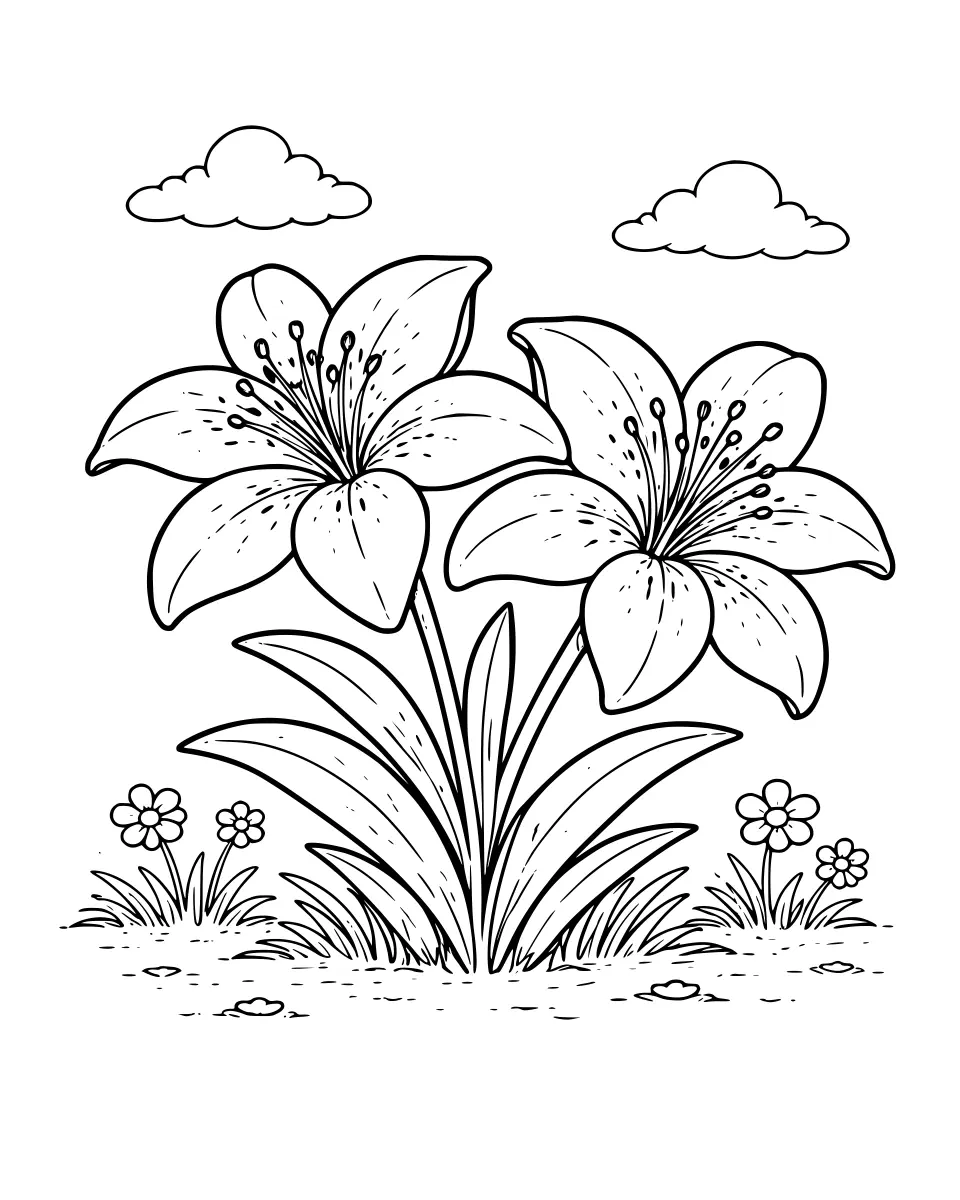 Color two blooming lilies with graceful leaves, small garden flowers, and fluffy clouds above. A calm, nature-inspired scene that’s relaxing and fun to finish.