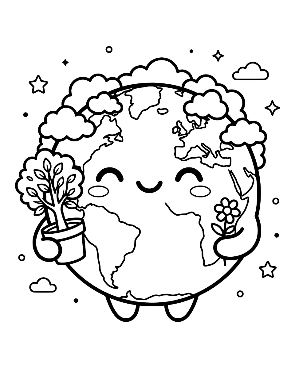 Color a smiling Earth holding a potted tree and a flower, with simple clouds and stars around it. A cheerful planet design for kids and classrooms.