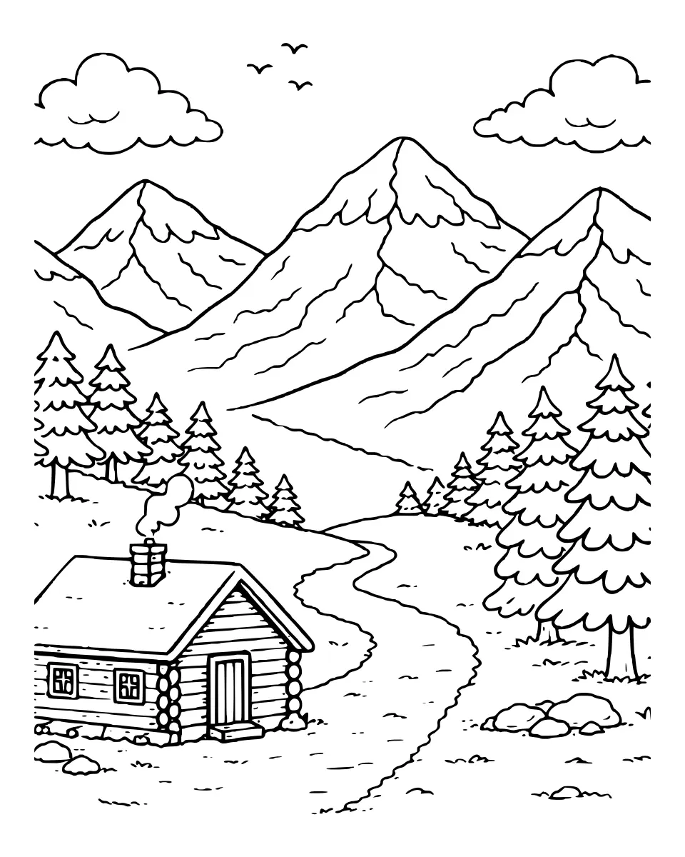 Color a peaceful mountain cabin scene with tall pine trees, rolling hills, and snowy peaks under fluffy clouds and birds—perfect for a relaxing nature break.