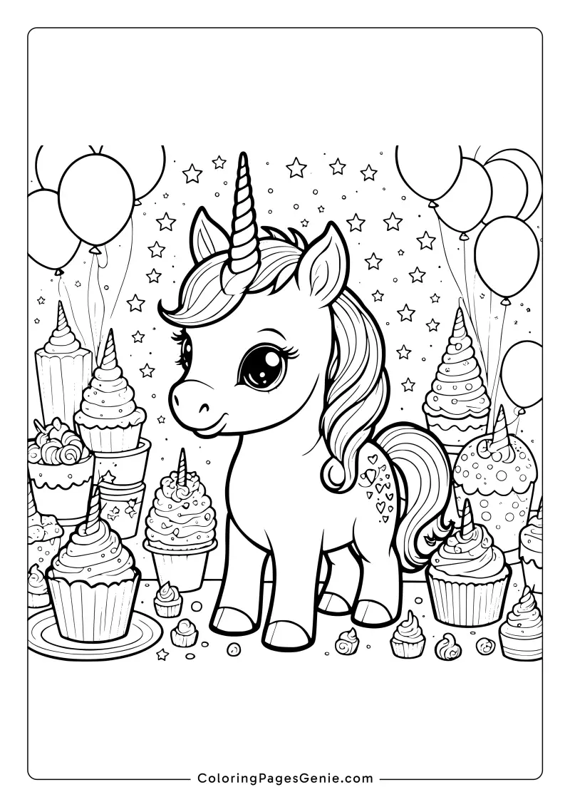 A cheerful unicorn celebrating with party decorations and a festive atmosphere. A fun and creative coloring activity for all ages who love magical moments.
